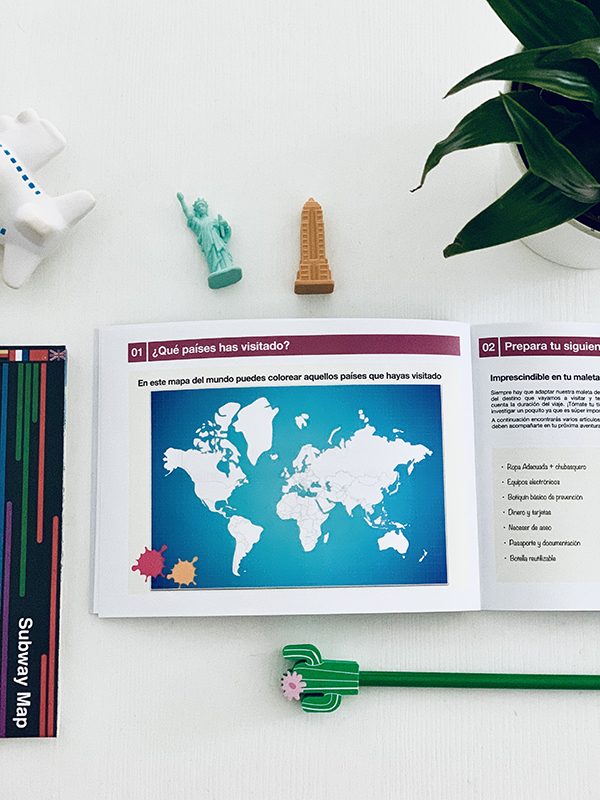 Un libro de tapa blanda con más de 100 hojas a todo color, con calidad óptima para escribir en ellas y espacio suficiente para organizar tus próximos destinos a visitar. Podrás colorear los países que hayas visitado, preparar tu maleta de imprescindibles en tu viaje, hacer un TOP 10 de lugares impresionantes, hacer un TOP 10 de las mejores comidas que hayas disfrutado en tus viajes, marcar en el casillero tus vivencias viajeras, hacer una lista de viajes soñados y organizar más de 20 viajes.